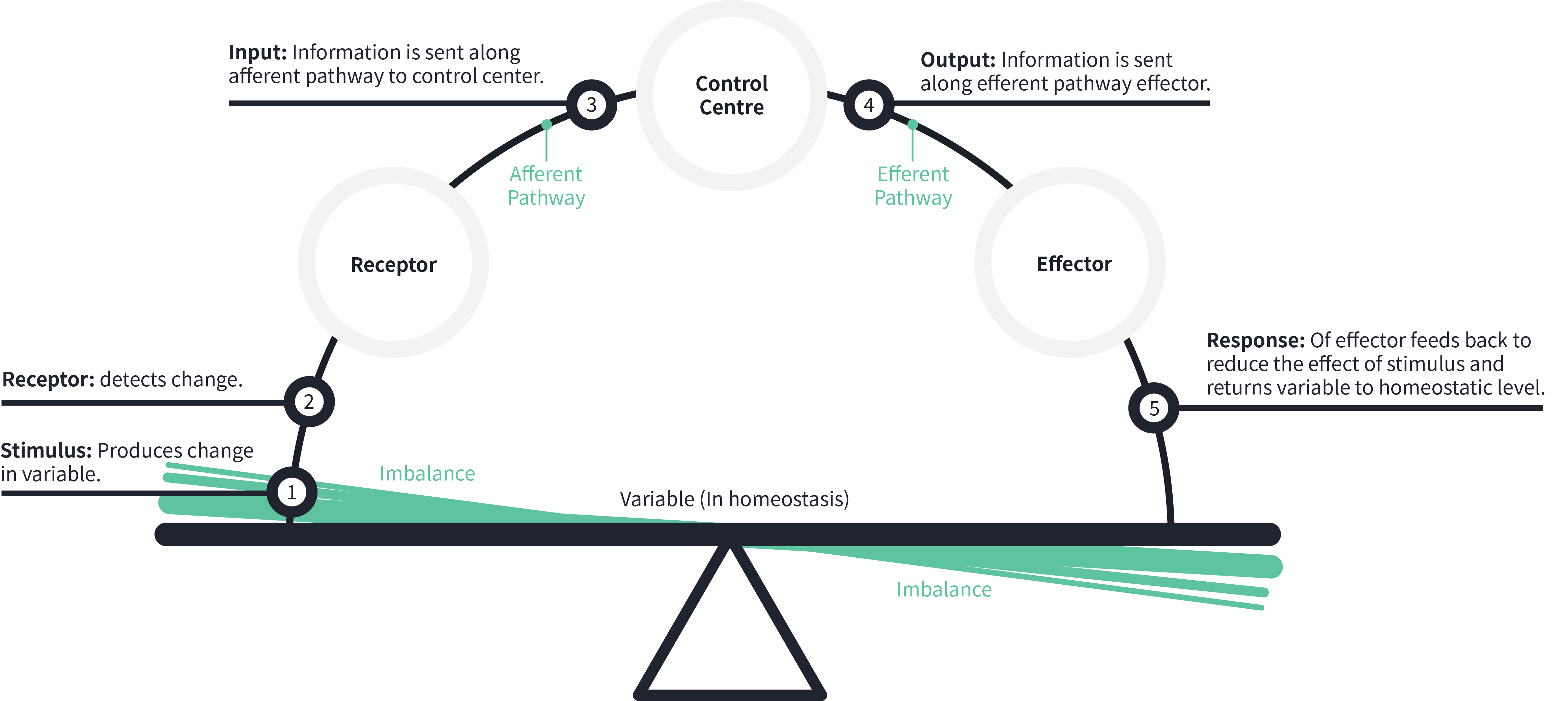 Let‘s take a look at these different components. First the Receptor. The receptor is responsible for responding to changes in the environment. We refer to these environmental changes as stimuli. The receptor responds by sending the information to the control center along what we call the afferent pathway. The control center is responsible for determining a set point. It analyzes the information and determines an appropriate response. This response to the stimulus is sent along an efferent pathway to the effector. The effector response by reducing the effect of the stimulus and helping return the system to homeostasis.